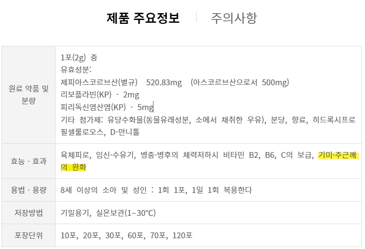 궁금해서 해당 제약회사 홈페이지에 들어가서 확인해 보니 기미·주근깨 완화의 효능·효과가 있다고 적혀 있습니다. 비타민 C를 꾸준히 복용하는 것만으로도 항산화제 역할을 하여 피부 노화 및 개선을 할 수 있다고 합니다. 또한 비타민 C는 육체피로와 활력 회복에 도움을 주니 1석 2조라고 생각됩니다.